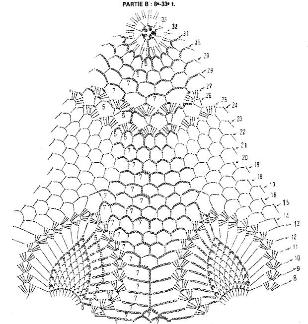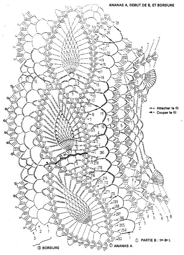 [показать]Квадратная скатерть, где лучики с ананасами расходятся от центра. На схеме 1/4 скатерти с пронумерованными рядами. Скатерть вяжется от центра кругами, "выступающие" края с ананасами довязываются по очереди, отдельно привязывая нить.
