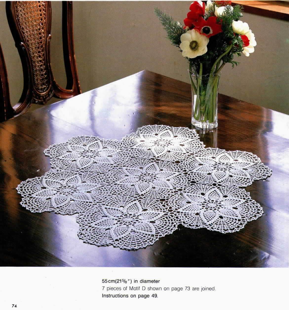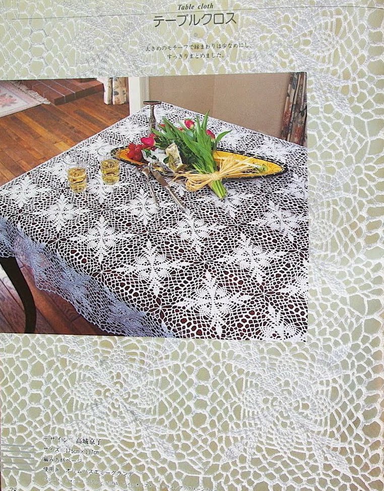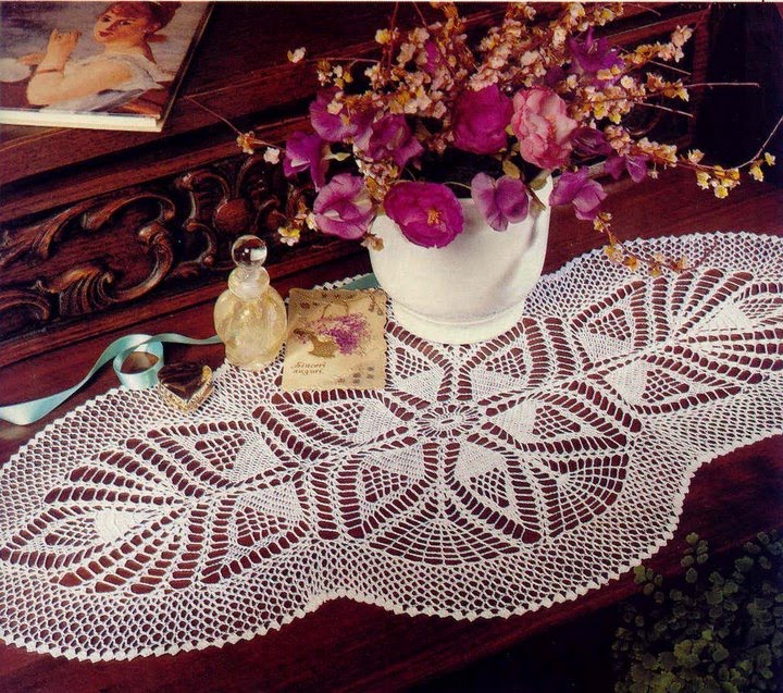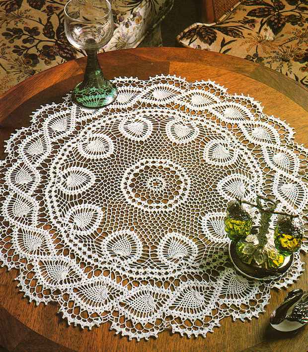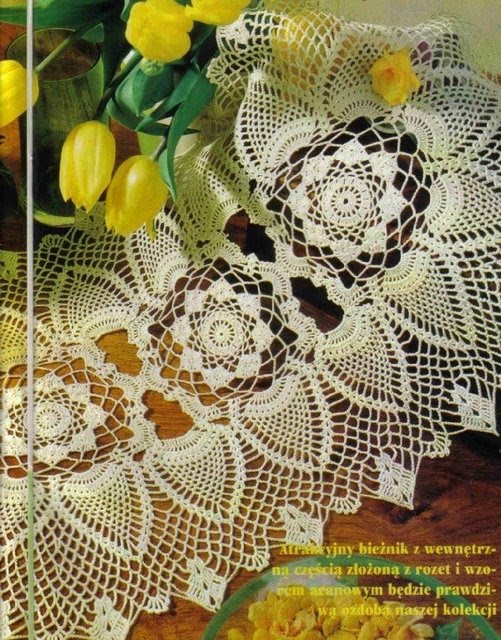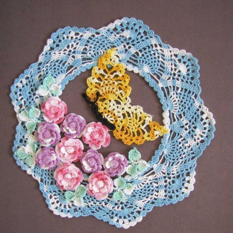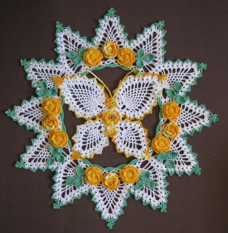 [показать]Эту вязаную скатерть обрамляют бабочки, составленные из рисунка "ананас".