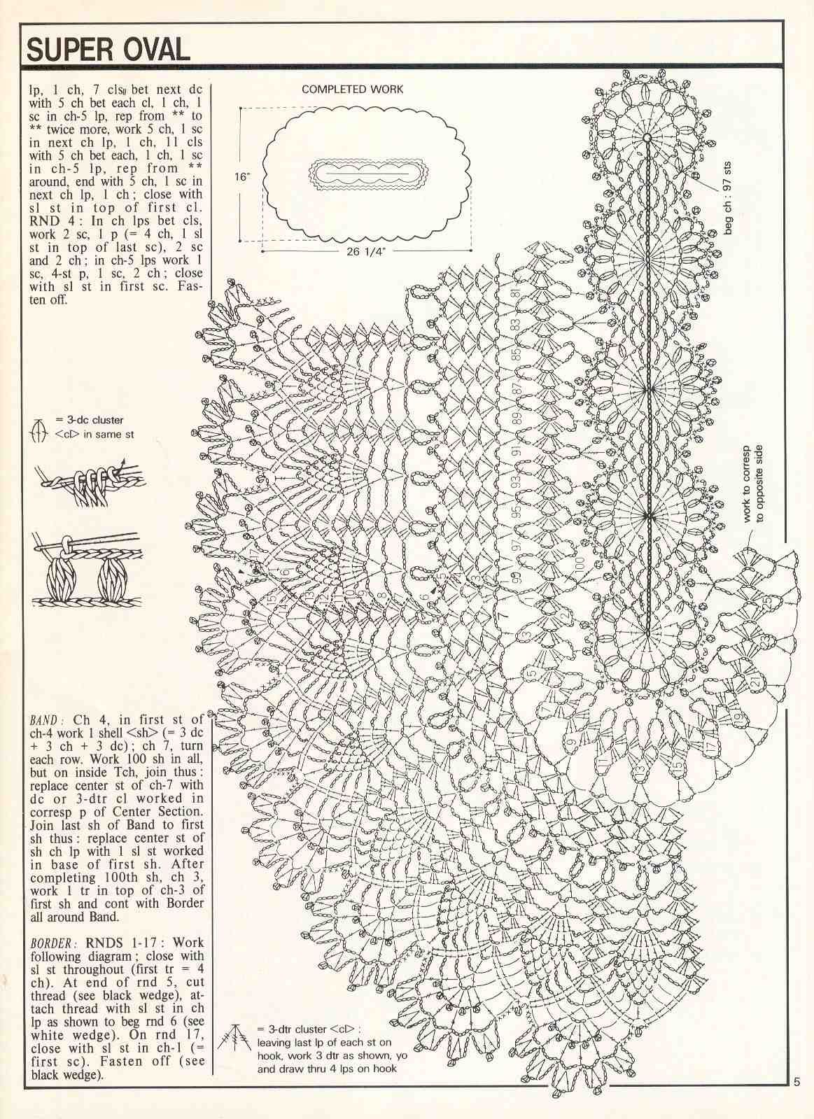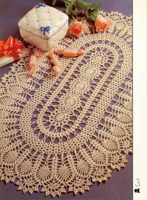 [показать]Широкая овальная дорожка с рисунком "ананас", связанная крючком. Что удобно в схеме - так что сами "ананасы" на краях расположились полукругом - этот рисунок можно использовать для вязания, например, юбки.