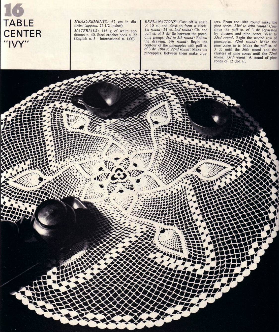 [показать]Очень симпатичная квадратная скатерть вяжется из центра по кругу. Мотивы "ананаса" расположены и в центре скатерти и образовывают два вида каймы.