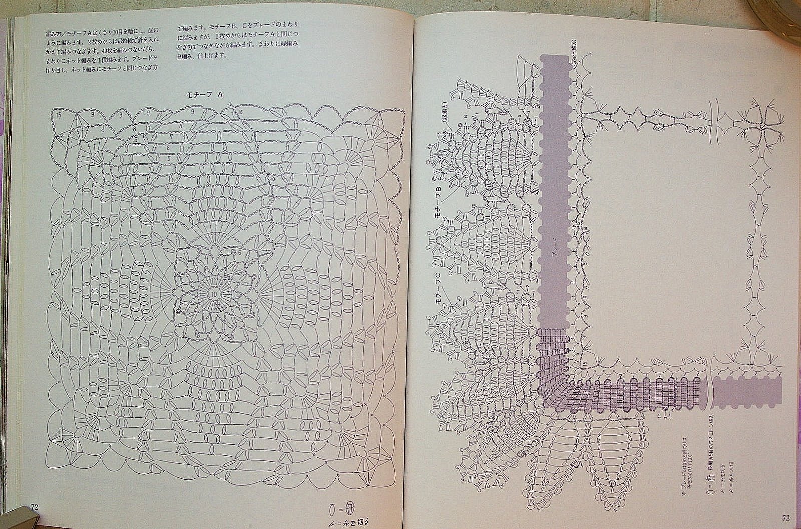 [показать]Схема этого мотива с "ананасом" маленькая, но читаемая. По этой схеме можно связать как отдельную салфеточку, подстаканник, так и собрать большой плед или скатерть/дорожку из таких мотивов.