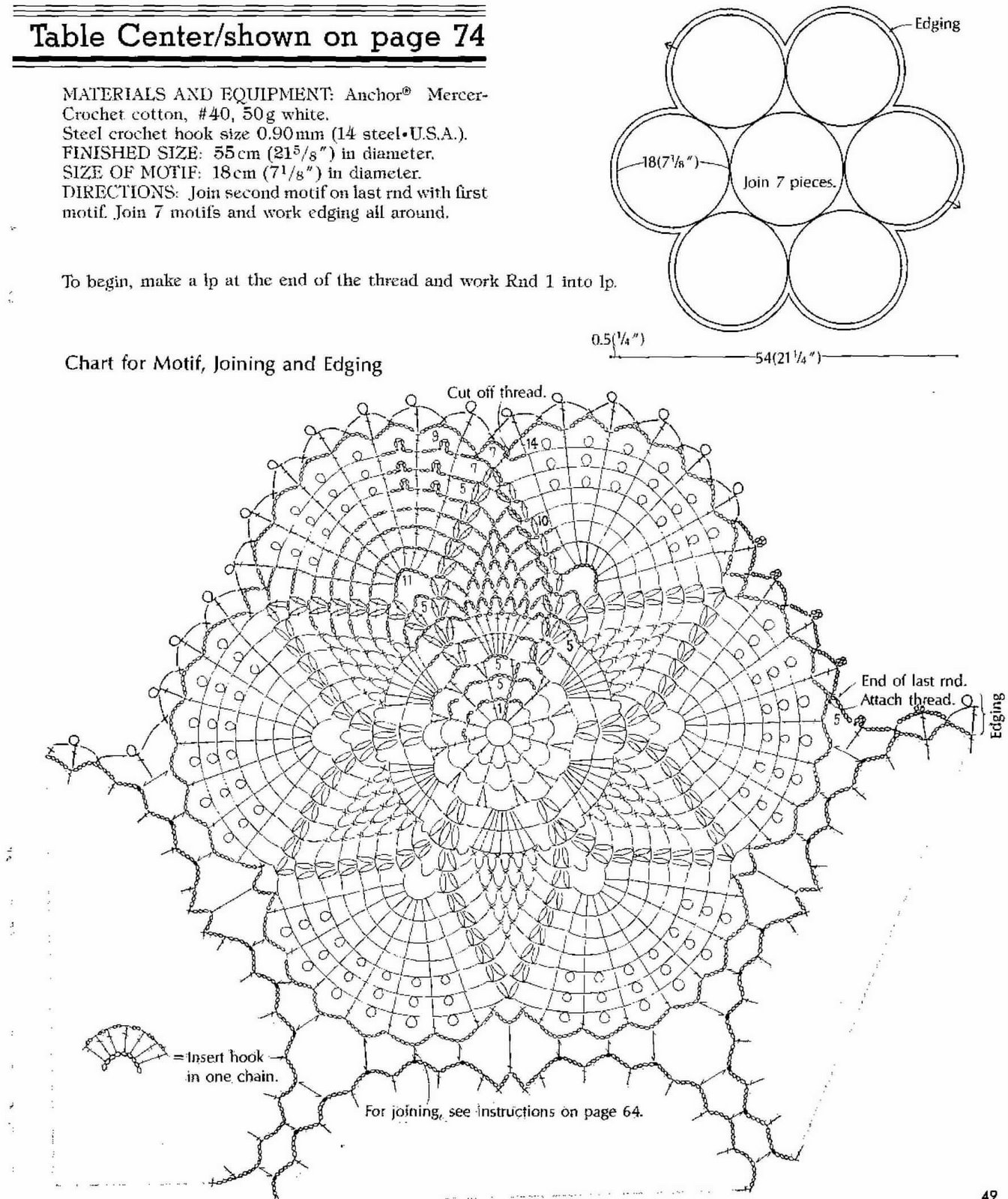 [показать]Скатерть собирается из квадратных мотивов (не забывайте соединять их между собой при провязывании последнего ряда). Далее скатерть обвязывается узкой каймой брюгсских кружев, а затем уже каймой из "ананасиков". Обратите внимание, что в "ананасах" пышные столбики из 5 провязанных вместе столбиков с накидом.