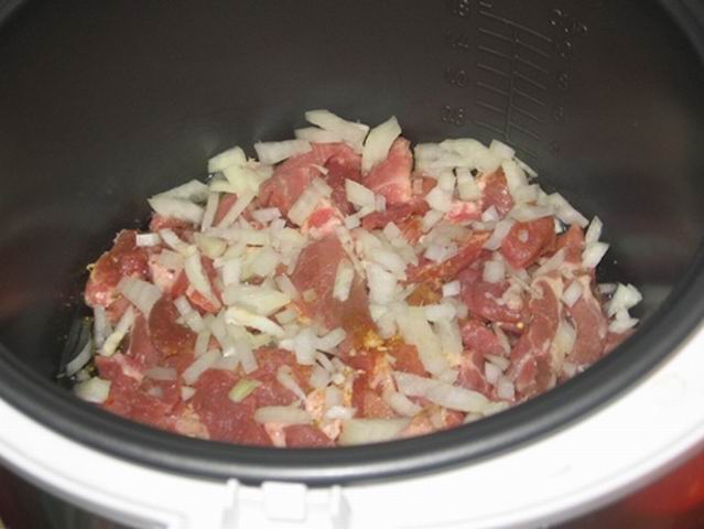 В кастрюлю наливаем растительное масло 3-4 столовые ложки. Закладываем в кастрюлю мультиварке мясо. Соль, приправы.