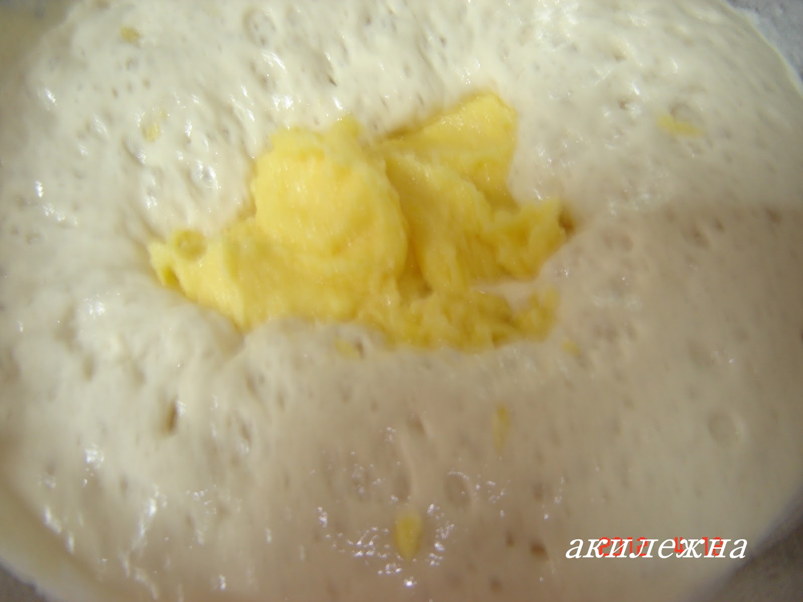 тесто, затем добавить соль, сахар, стертый добела с яичными желтками, растопленное