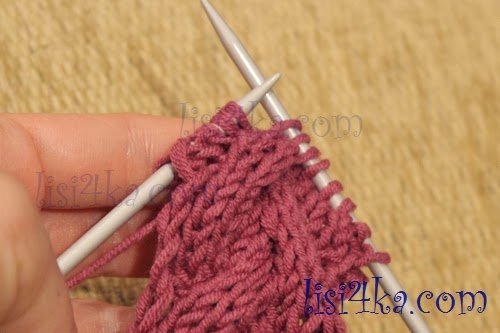 Провязываем три следующие петли (второе переплетение косы). На рабочей спицы получается: кромочная, изнаночная, Три непровязанных лицевых петли, и три провязанных петли.