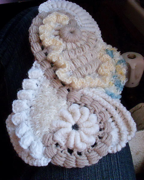 Начиная вязать, запаситесь 12-15-ю различных по фактуре пряж. Это минимальное количество, при одноцветных полотнах это количество можно уменьшить до 10, сделав упор на фактуру пряжи. (Ориентировочные данные для начинающих). Старайтесь не вязать очень толстой пряжей (100-150м/100г). Из тонкой пряжи мотивы получаются мелкие, но зато их больше и в общем полотне это выглядит лучше. Маленький секрет для убыстрения работы – вяжите мотивы и обвязки тонкой пряжей (около 400-600м\100г) , а соединение скрамблей и мотивов можно сделать более толстой ниткой (250м\100г) выполняя различные рельефные столбики. На фото ниже показан пример скрамблия, выполненного разными пряжами толщиной не более 350м/100г.
