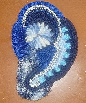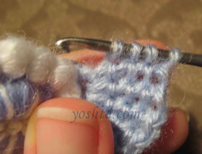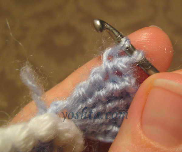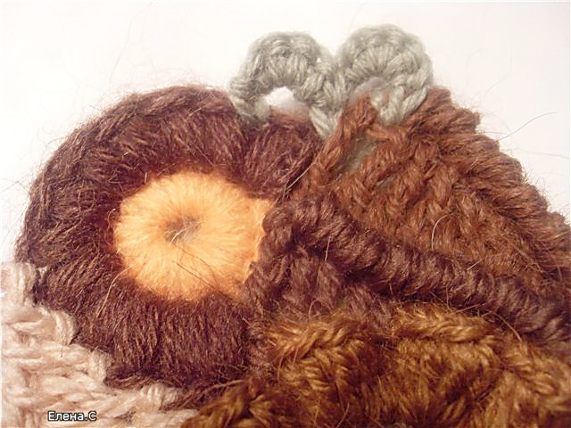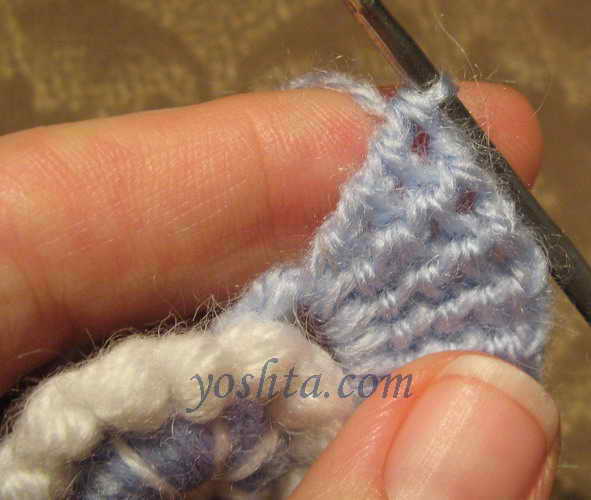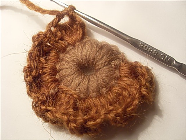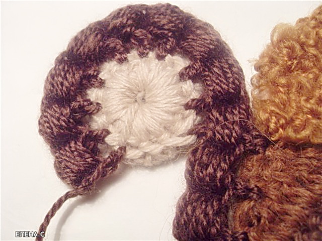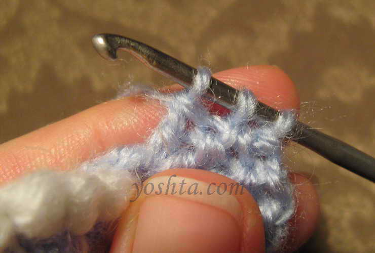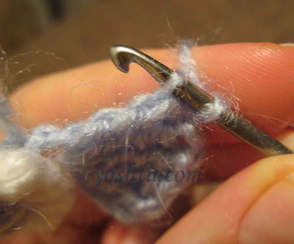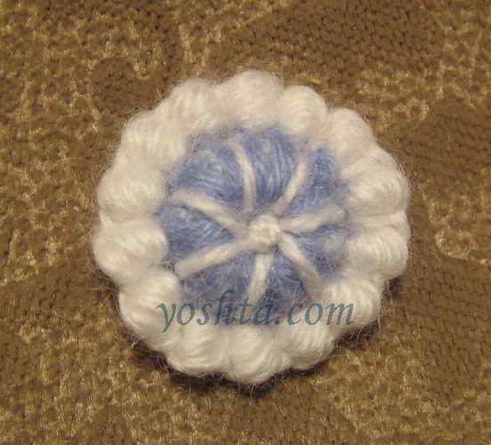 Серединку вяжем голубой нитью. Вяжем цепочку из воздушных петель, соединяем в кольцо, обвязываем один ряд столбиками. Следующий ряд обвязываем темно-голубой нитью столбиками, крючок вводим в кольцо. Переворачиваем, теперь изнаночная сторона становится лицевой.