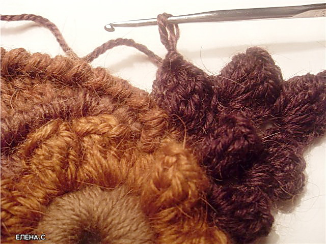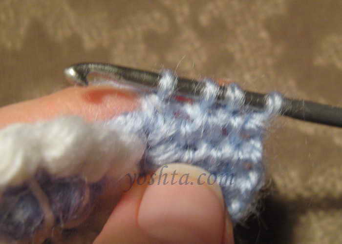 2. Далее начинаем вязать от уже связанного элемента. Привязываем нить и начинаем вязать 2-3 СБН, потом 2-3 СН, потом С2Н. Количество столбиков разного вида по собственному желанию. Затем вяжем обратным ходом рачий шаг. Ряды столбиков можно повторять несколько раз - получается как бы веерочек.