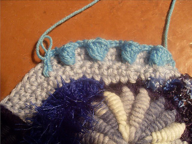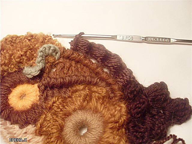 5. Все мотивы у нас достаточно выпуклые, рельефные. Чтобы подчеркнуть рельефность элементов надо связать что-то плоское. Я предлагаю элемент тунисского вязания. Так как я буду набирать от 6 до 10 петель, то длинный крючок не требуется, можно обойтись обычным. Провязав 5-6 рядов в последнем ряду я набираю петли не до конца и он получился укороченным. Это я делаю для того, чтобы избежать правильной формы. Привязываем нить другого цвета и вяжем 2 арочки из трех воздушных петель (ВП) берем какую-нибудь фантазийную пряжу. В данном случае "букле", привязываем к нашему вязанию и провязываем небольшой кусочек СБН, так чтобы арочки из ВП были перед работой. (прижали их пальцем и провязываем за ними). Все хвостики ввязываем в работу, потом отрезаем.