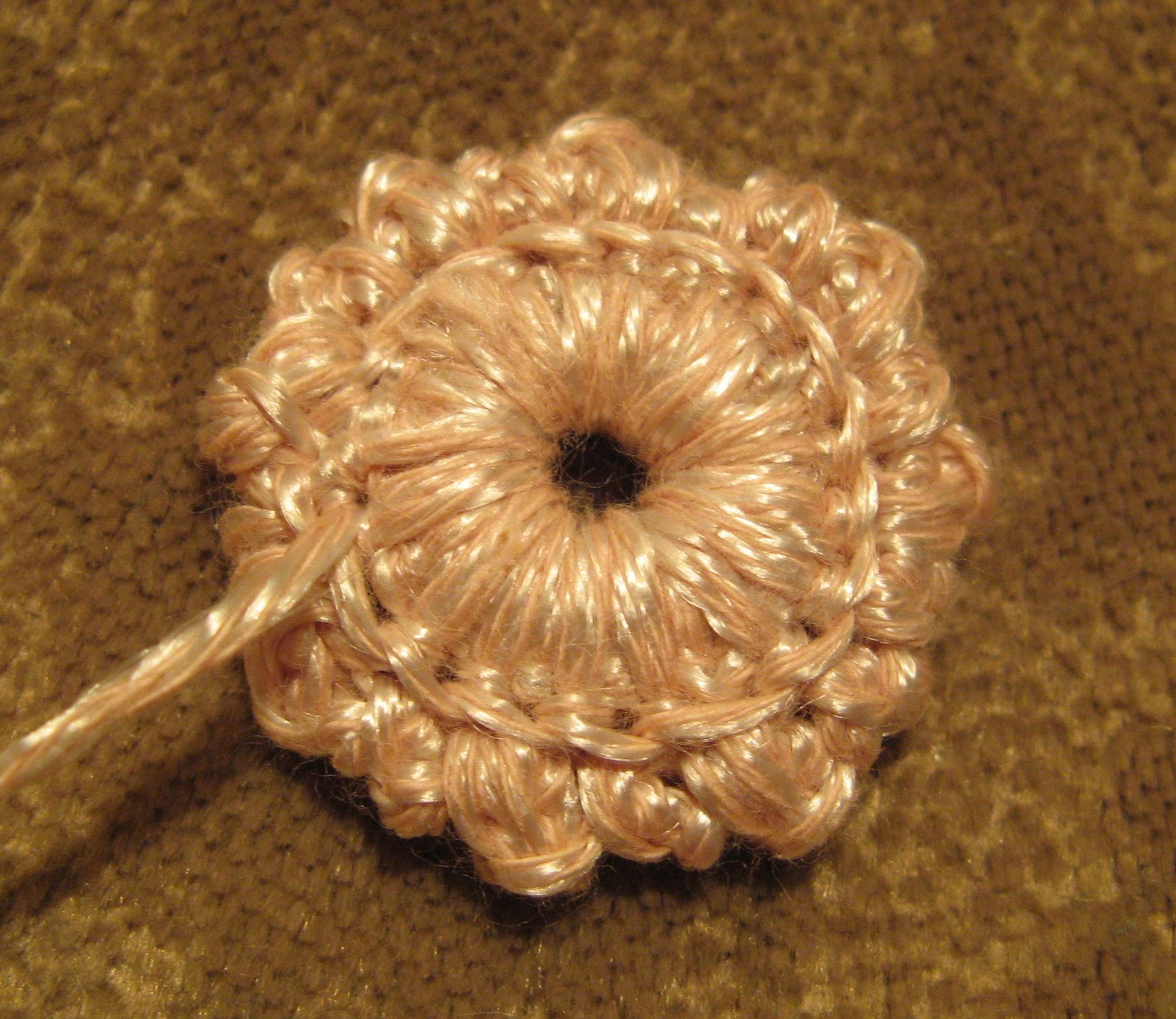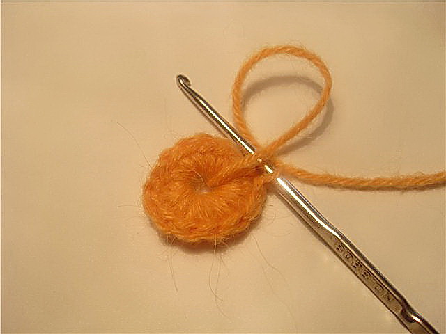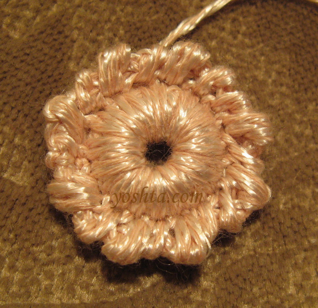 С изнаночной стороны на одном конце нити вяжем три воздушные петли, замыкаем в кольцо и закрепляем. Вятягиваем получившийся узелок на лицевую сторону через центр.