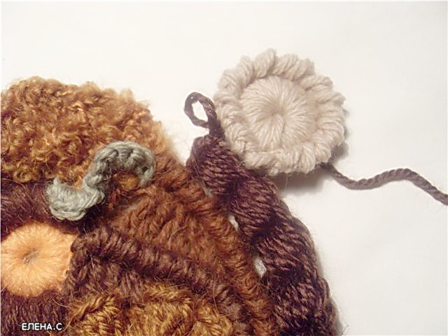 3. Следующий элемент – «пуговка», «ягодка»: Связали цепочку из 4-5-6 ВП, замкнули в кольцо, обвязали кольцо СБН. Чтобы было более выпукло - поверху обвязываем уже обвязанное кольцо еще раз. Далее привязываем нить другого цвета и по полученному колечку в каждую петлю основания выполняем пышные столбики на 4-5 накидов. Вот и готовый элемент. Часто делаю незавершенные круговые мотивы. На мой взгляд, они лучше вписываются в уже готовый скрамбль.