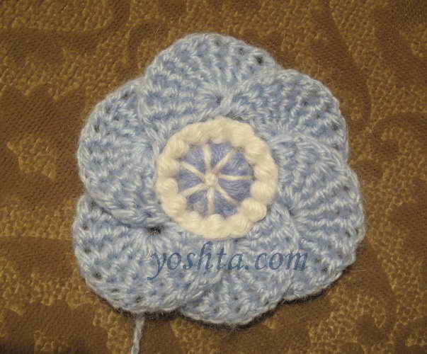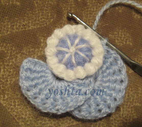 Сначала обвязываем лепестки темно-голубой нитью "рачьим шагом 3b", а затем и серединку цветка, комбинируя "рачий шаг 4" и "рачий шаг 5"