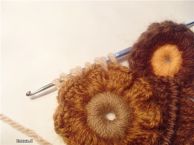 Вязание лепестков происходит так же, как в цветке ирландского вязания. Только вместо столбиков с двумя накидами провязываем сцепленные (или как их ещё называют, соединенные столбики):