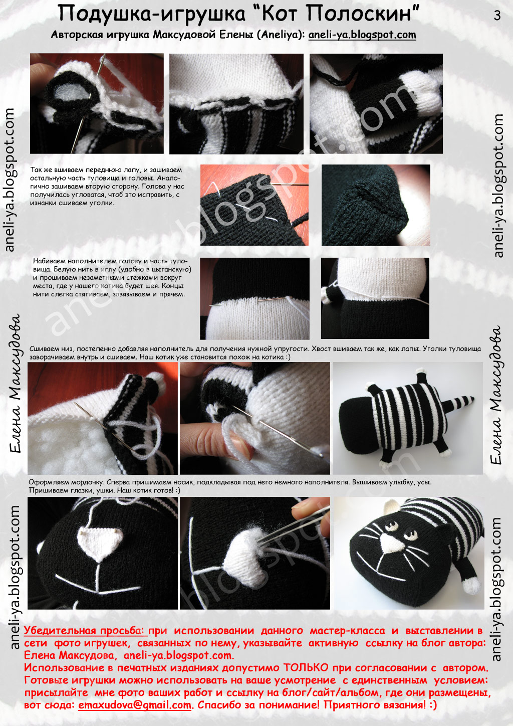 Для того, чтоб картинка открылась в нормальном разрешении, надо щелкнуть по ней правой кнопкой мыши и в контектном меню выбрать "открыть изображение в новой вкладке". Еще хочу предложить идею - если набить нашему котику только голову, а шею зашить, то получим игрушку-мешок для пижамы или прочих детских секретиков. Низ тогда можно сделать на пуговках или кнопках. В общем, фантазируйте и делитесь вашими идеями!