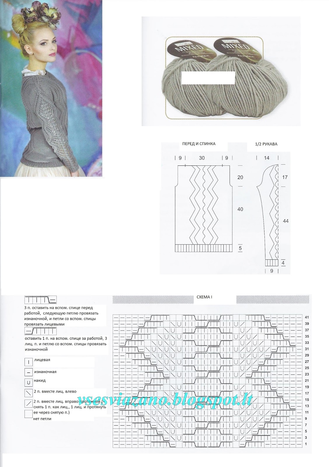 Набрать 32 п. и провязать 4 см резинкой *1 лицевая, 1 изнаночная*, затем продолжить основным узором по схеме I, при этом для скоса рукава с обеих сторон в каждом 10-м р. прибавить 1 п.