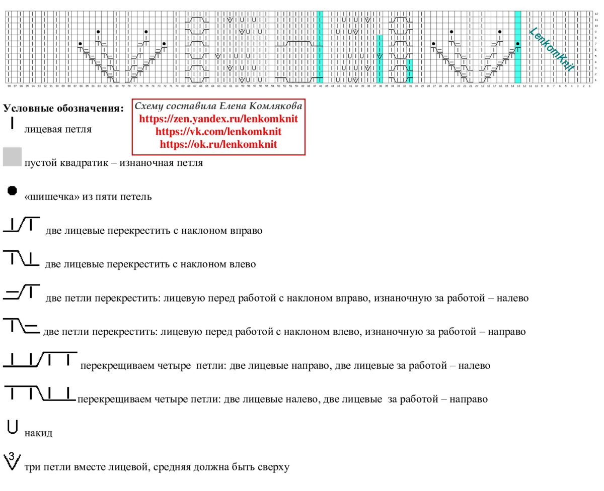На этой схеме - узор для правой и левой полочки. Раппорт - 46 петель (плюс две петли по краям) и 136 рядов. Этот же узор можно связать и по центру спинки. В верхней части спинки отчетливо видна часть узора с этой схемы, начиная с ряда № 107.