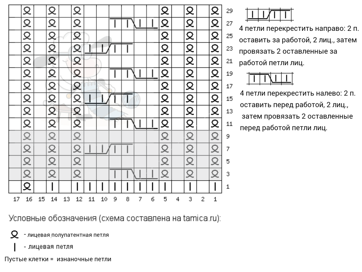 Раппорт узора состоит из 17 петель и 8 рядов (выделен серым цветом). 1-й и 2-й ряды схемы — установочные и вяжутся аналогично первым двум рядам белого пуловера. Кстати, если перекрещивания петель в "косе" кажутся вам слишком частыми, провязывайте их не через 2 ряда, как на схеме, а через 4: добавьте ещё по одному лицевому и изнаночному ряду.