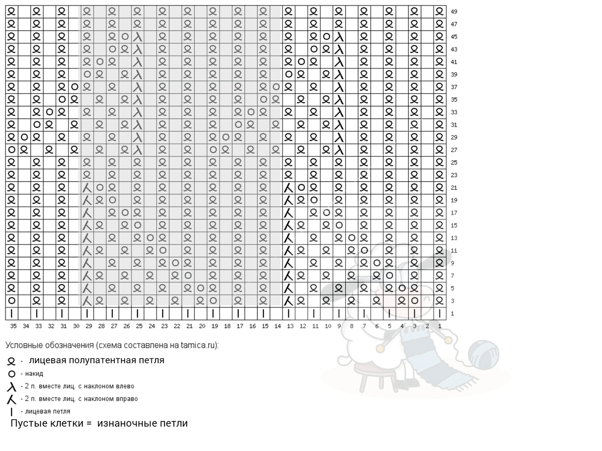 В начале ряда провязывать петли перед раппортом (с 1-й по 13-ю), затем повторять необходимое количество раз петли раппорта (с 14-й по 29-ю), закончить ряд петлями после раппорта (с 30-й по 35-ю). В высоту повторять ряды с 3-го по 50-й, 1 и 2 ряды — установочные. Вяжутся так: 1-й ряд: по схеме, 2 ряд: лицевые петли провязать лицевыми, изнаночные снять с накидом, как изнаночные п. Лицевые полупатентные петли вязать так, как описано в разделе "Узоры".