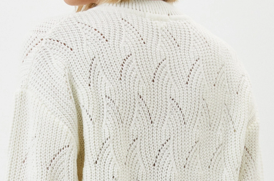 Немного спущенное плечо, V-образный вырез горловины и длинный рукав в сочетании со свободным облеганием и небольшой длиной делают пуловер привлекательным, а белый цвет добавляет праздничности.