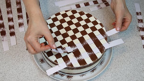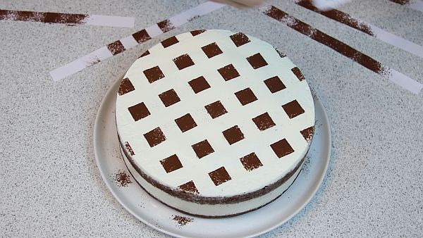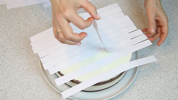 Из бумаги изготавливаем полоски шириной 2 см. Раскладываем на торте и убираем через одну полоску.
