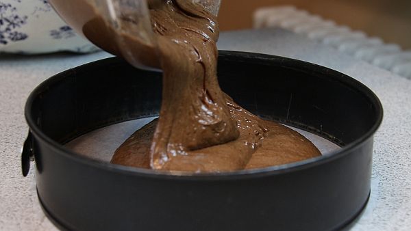 Я использовала разъёмную форму диаметром 26 см, низ формы застелила бумагой для выпечки, борта ничем не смазывала. Бисквитное тесто выливаем в форму.