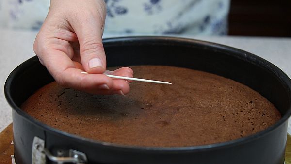 Форму можно несколько раз прокрутить, чтобы бисквитное тесто легло ровно. Выпекаем бисквит в предварительно разогретой до 180°С духовке примерно 40-45 минут. Готовность определяем лёгким надавливанием пальца на середину – палец не должен проваливаться. Или при помощи деревянной палочки, из центра бисквита она должна выходить чистой, без следов теста.