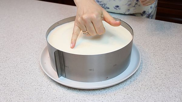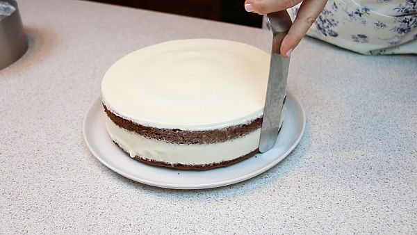 Аккуратно снимаем форму. Можно её прогреть бытовым феном или горячим полотенцем. Подравниваем бока торта.
