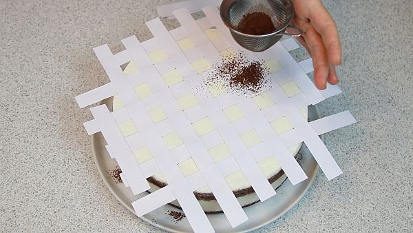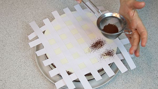 Чистыми полосками закрываем квадратики с какао и ещё раз просыпаем какао-порошком.