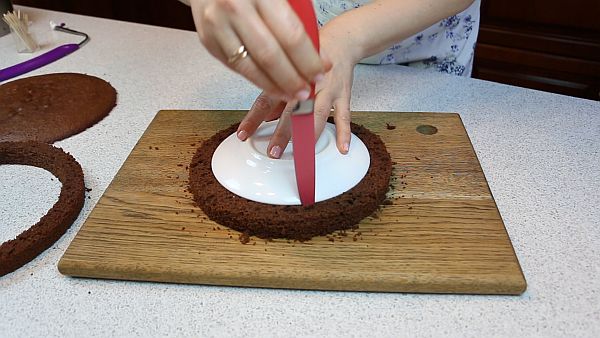Тонкий корж пока откладываем, а двухсантиметровый корж разрезаем на окружности шириной в 2 см. Для этого можно подготовить шаблоны из бумаги и разрезать корж по шаблонам. А можно использовать что-то подручное, как я и поступила.