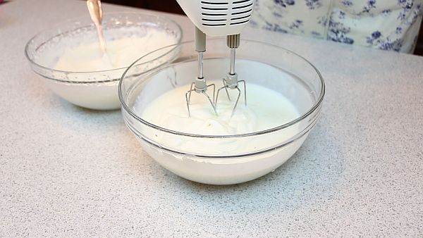 Куриные яйца разделяем на белки и желтки. К белкам добавляем щепотку соли и взбиваем, постепенно добавляя примерно 1/5 часть всего необходимого по рецепту сахара. Взбиваем белки до устойчивого состояния.