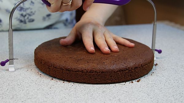 Разрезать бисквит желательно не ранее, чем через 4-5 часов после выпечки. Можно испечь бисквит накануне вечером. После того, как он полностью остынет, завернуть его в пищевую плёнку и положить в холодильник.