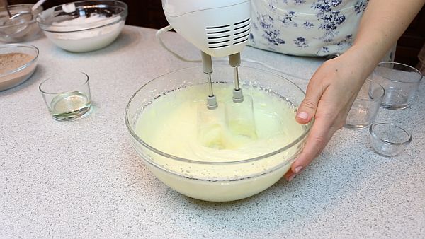Затем взбиваем желтки. Постепенно добавляем горячую воду, затем ванильный сахар и постепенно добавляем оставшийся сахар. Взбиваем до образования светлой, воздушной массы.
