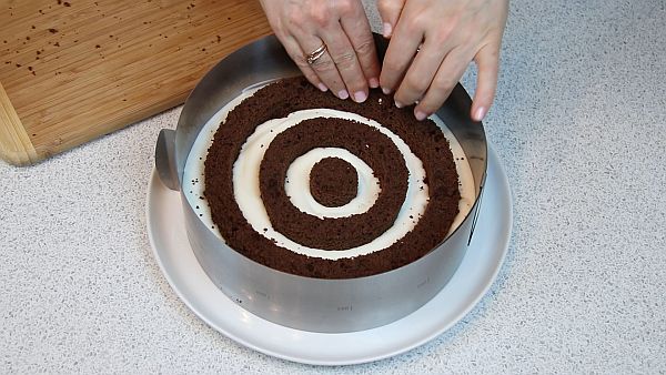 Устанавливаем кондитерское кольцо, выкладываем тонкий слой творожного крема и аккуратно раскладываем вырезанные бисквитные кольца.