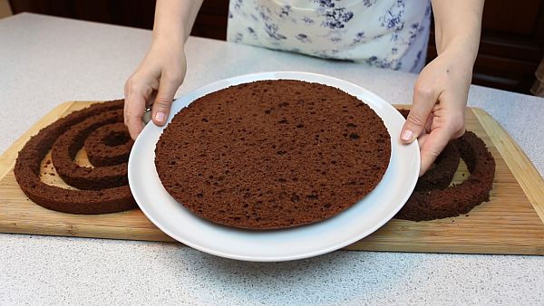 Верхний срезанный корж бисквита кладём на сервировочную тарелку.