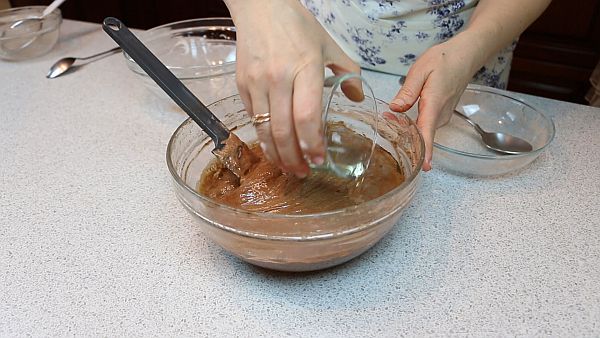 Смешиваем муку, какао-порошок, разрыхлитель, смешиваем как можно тщательнее, чтобы все сухие ингредиенты равномерно распределились по объёму, а затем просеиваем.