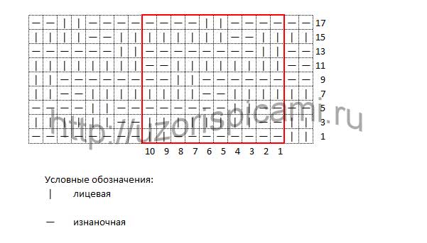 Раппорт узора составляет 10 петли + 12 петель (2 петли до раппорта и 10 петель после раппорта) + 2 кромочные и 18 рядов, или число петель должно быть кратным 10 + 2 +2 кромочные.
