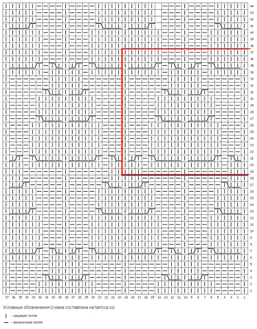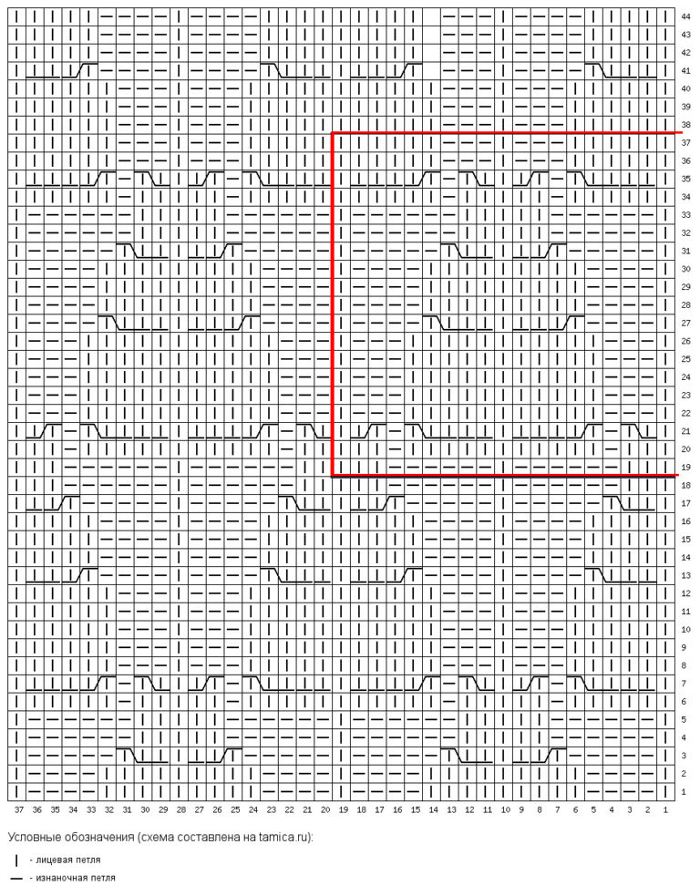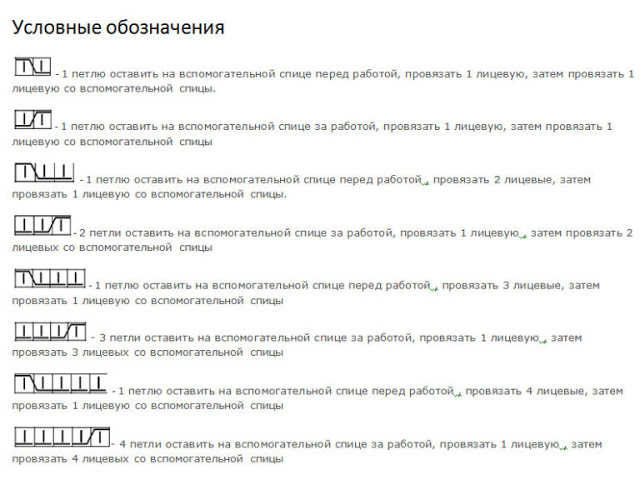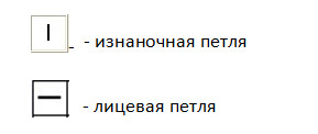 Петли изображены так, как они выглядят на лицевой стороне, поэтому нечетные ряды вяжем по большой схеме, а в четных рядах, которые мы вяжем на изнаночной стороне, условные обозначения такие: