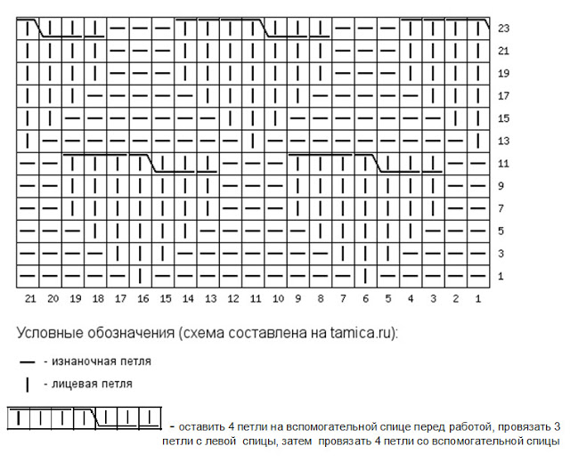 11 ряд: * 2 изн., оставить 4 петли на вспомогательной спице перед работой, провязать 3