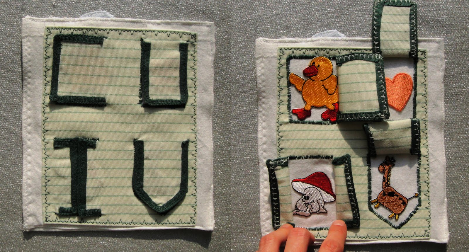 Все липучки к деталям пришиты таким образом, что колючие части липучек на коврике, а мягкие - на детальках.