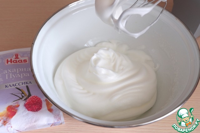 Яичные белки взбить с щепоткой соли до стойких пиков. |