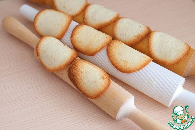 Готовое, еще горячее печенье поместить на скалку для придания изогнутой формы. |