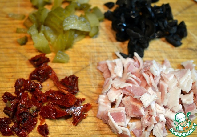 Вяленые томаты, бекон, маслины и огурец нарезать мелким кубиком. |