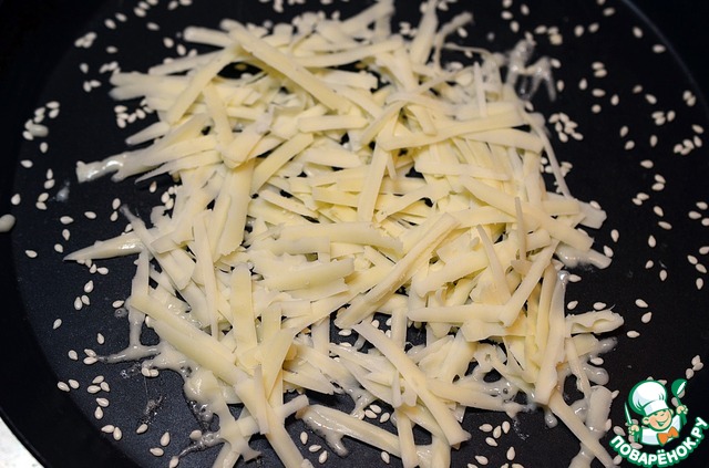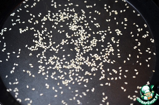 Сковороду с антипригарным покрытием разогреть. Бросить щепотку кунжута. |