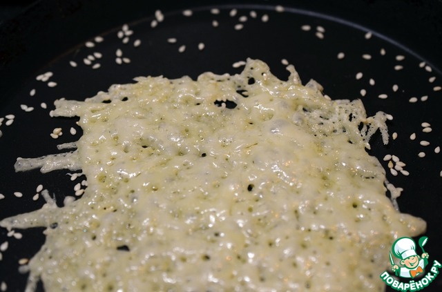 Затем натёртый сыр не очень толстым слоем, придав ему форму квадрата. |