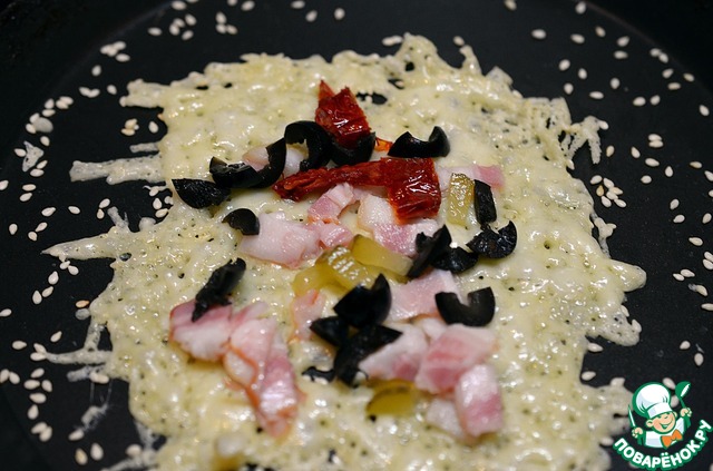 Подождать когда сыр запузырится и по краям станет чуть затвердевать. |