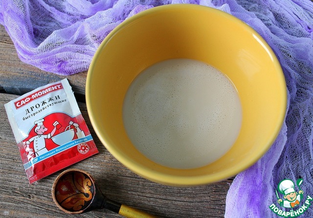Половину молоко подогреть и добавить 1 ст. л. сахара и дрожжи. Перемешать. Оставить на 10-15 минут в тепле, до появления пенной шапочки. |