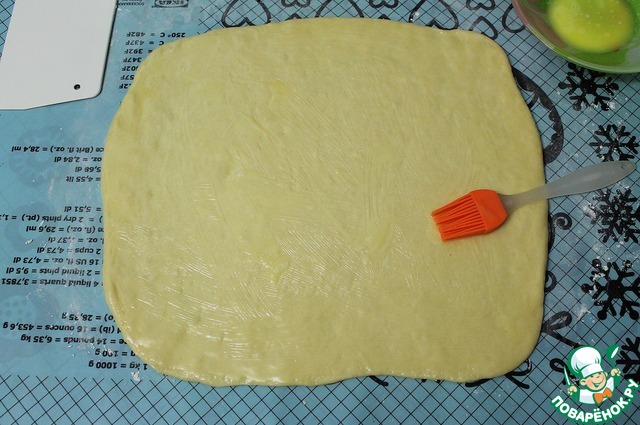 Подошедшее тесто, на подпыленной мукой поверхности, раскатываем в прямоугольник. Растапливаем 30 г сливочного масла и смазываем обильно тесто. |