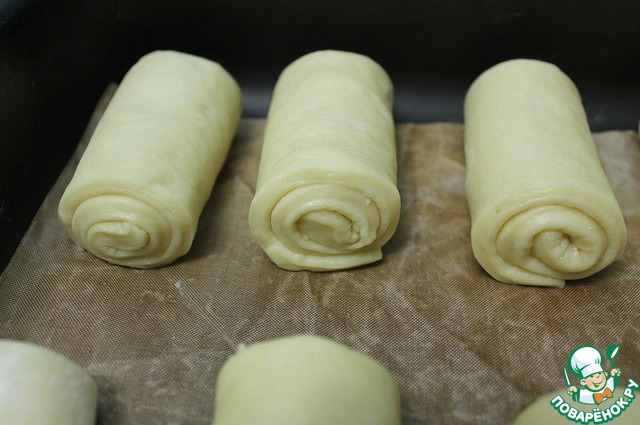 Сворачиваем каждый кусочек в рулетик, не плотно!!! Выкладываем в форму и оставляем минут на 20-30 в теплом месте. Выпекаем при 180 С ~ 20 минут. |