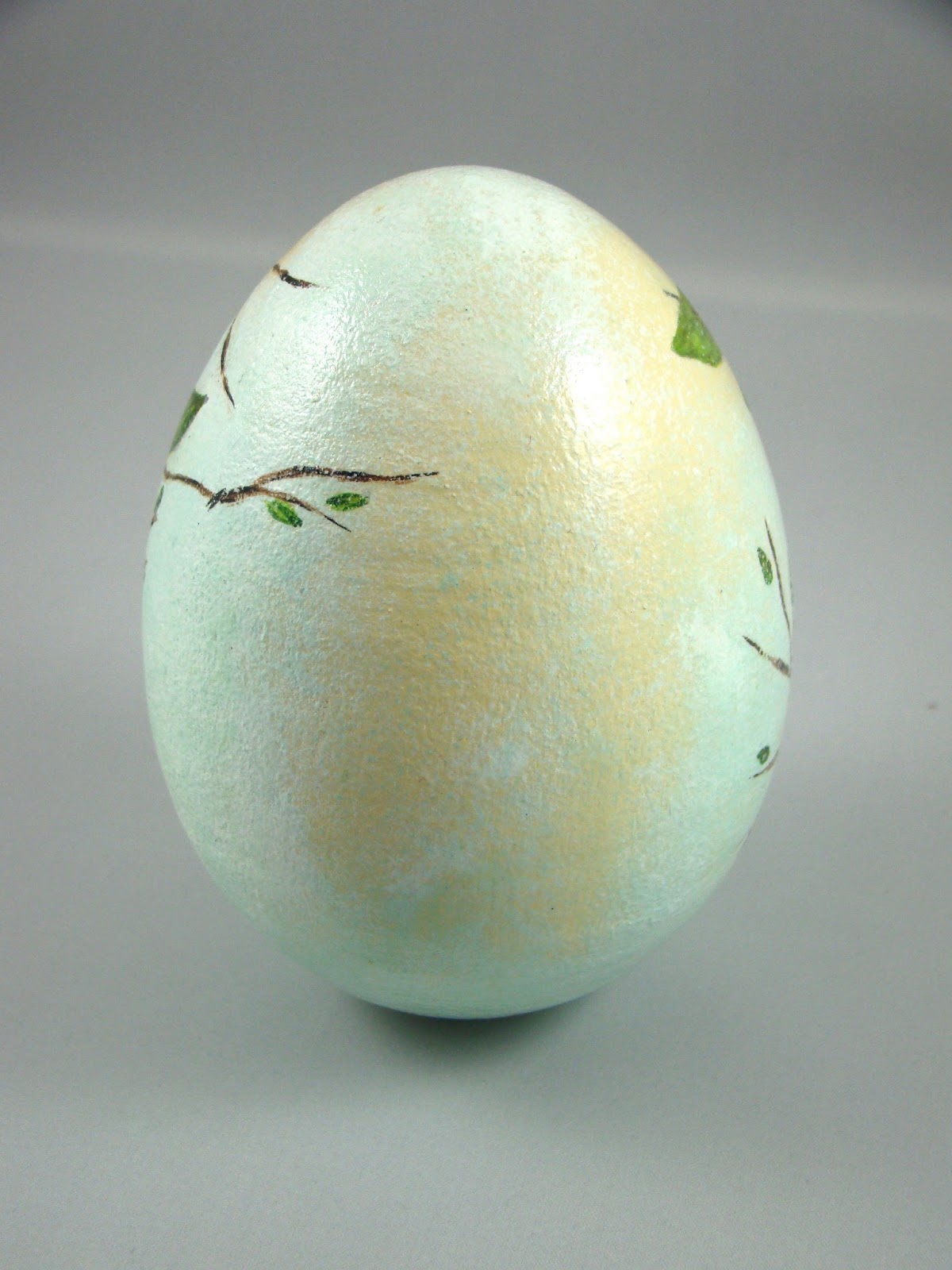 7. Покрыли яичко 2 -мя слоями лака. Просушили. Теперь делаем набрызг акриловой краской. Как делать вспоминаем здесь. Я сделала 2 красками: Умбра жженая и Сиена. После высыхания капелек, стираем лишнее с птички и элементов, которые этого требуют.