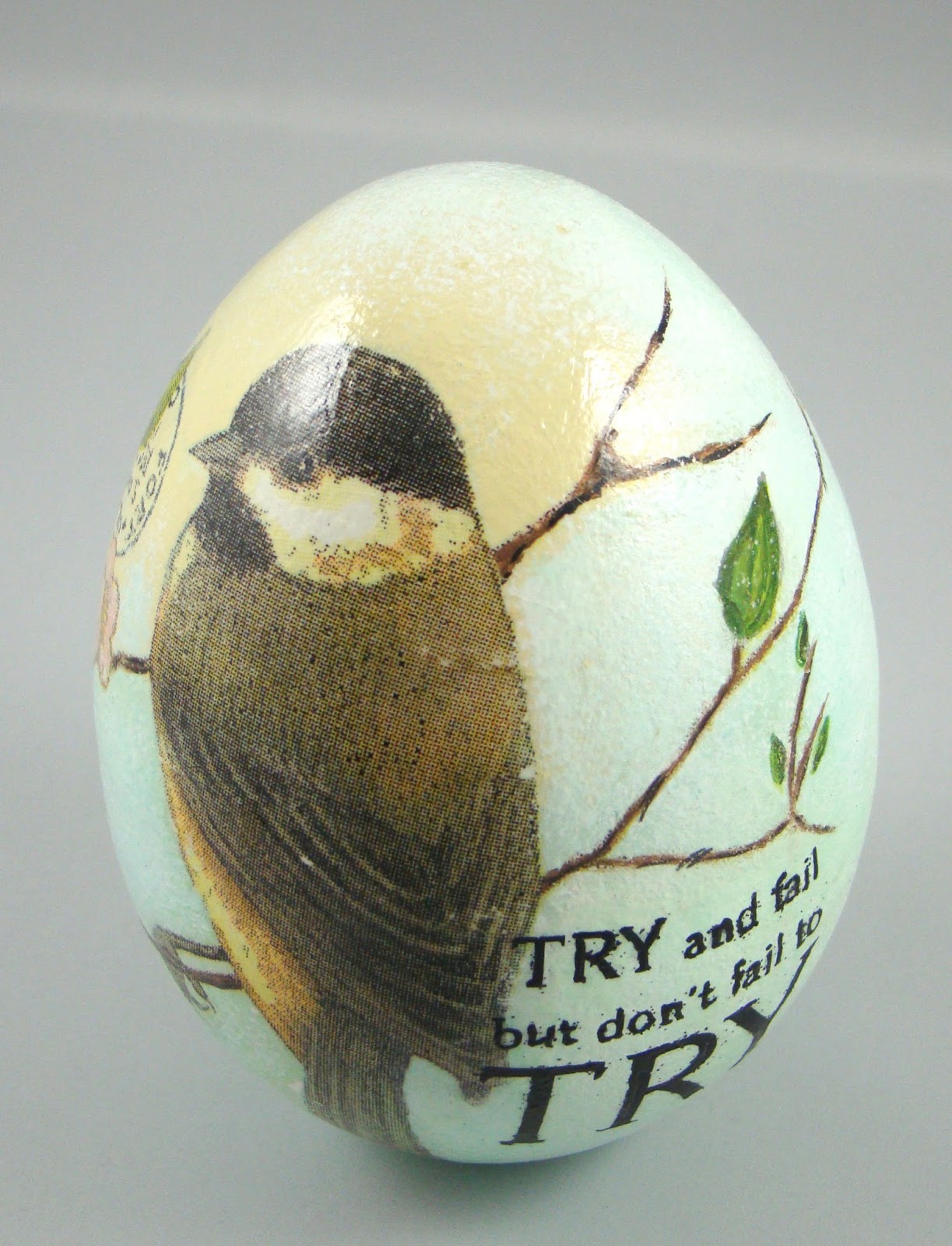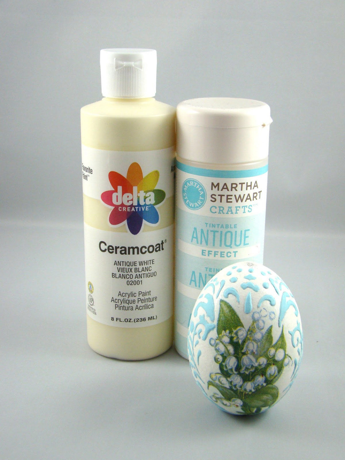 6. Для создания покрытия "яичная скорлупа". Я воспользовалась акриловой краской "античный белый" + Antiqe effect от Martha Stewart. Смешала их в пропорции 1/1. Нанесла губкой поролоновой на яйцо. Так сравняла фон.Картинку покроем 2-мя слоями лака. Только картинку.